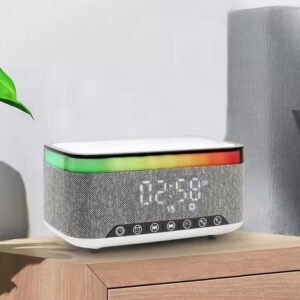 Original price was: $16.00.$15.00Current price is: $15.00.Multifunction 3 in 1 Alarm Clock Wireless Charger +10W Dual Bass Speaker +RGB Night Desk Lamp