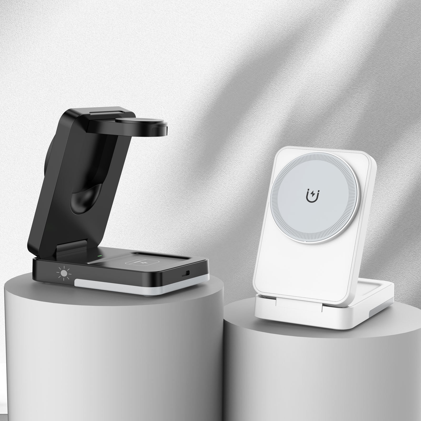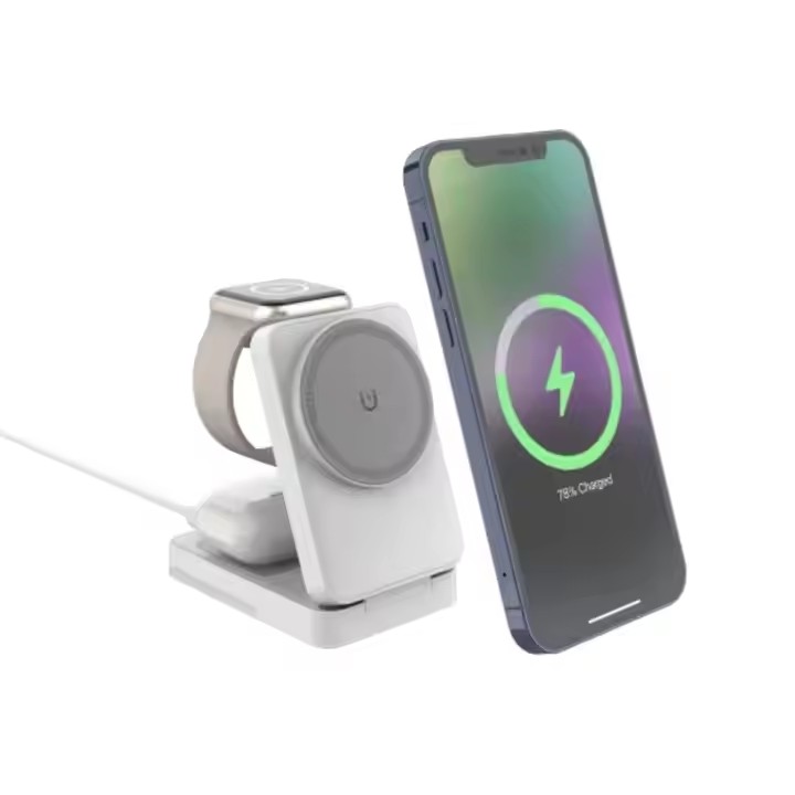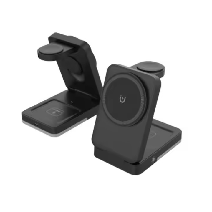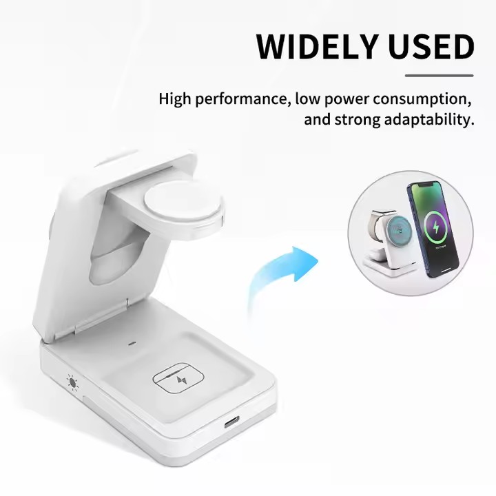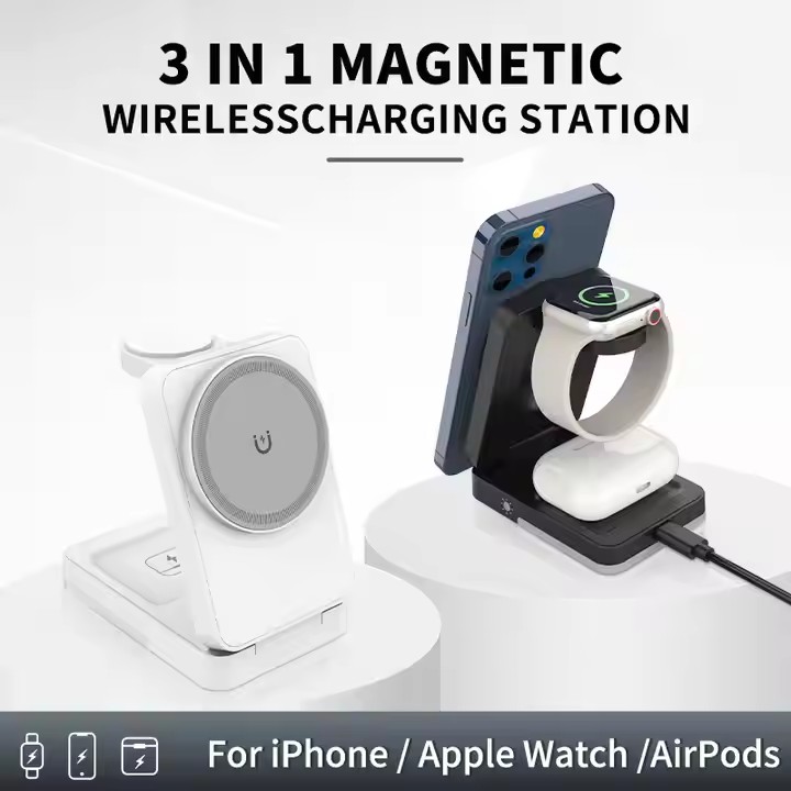 / W12 – OEM 3-in-1 Travel Magnetic 15W Qi Wireless Charger Foldable Plastic Design for Phone Smart Watch Earbuds